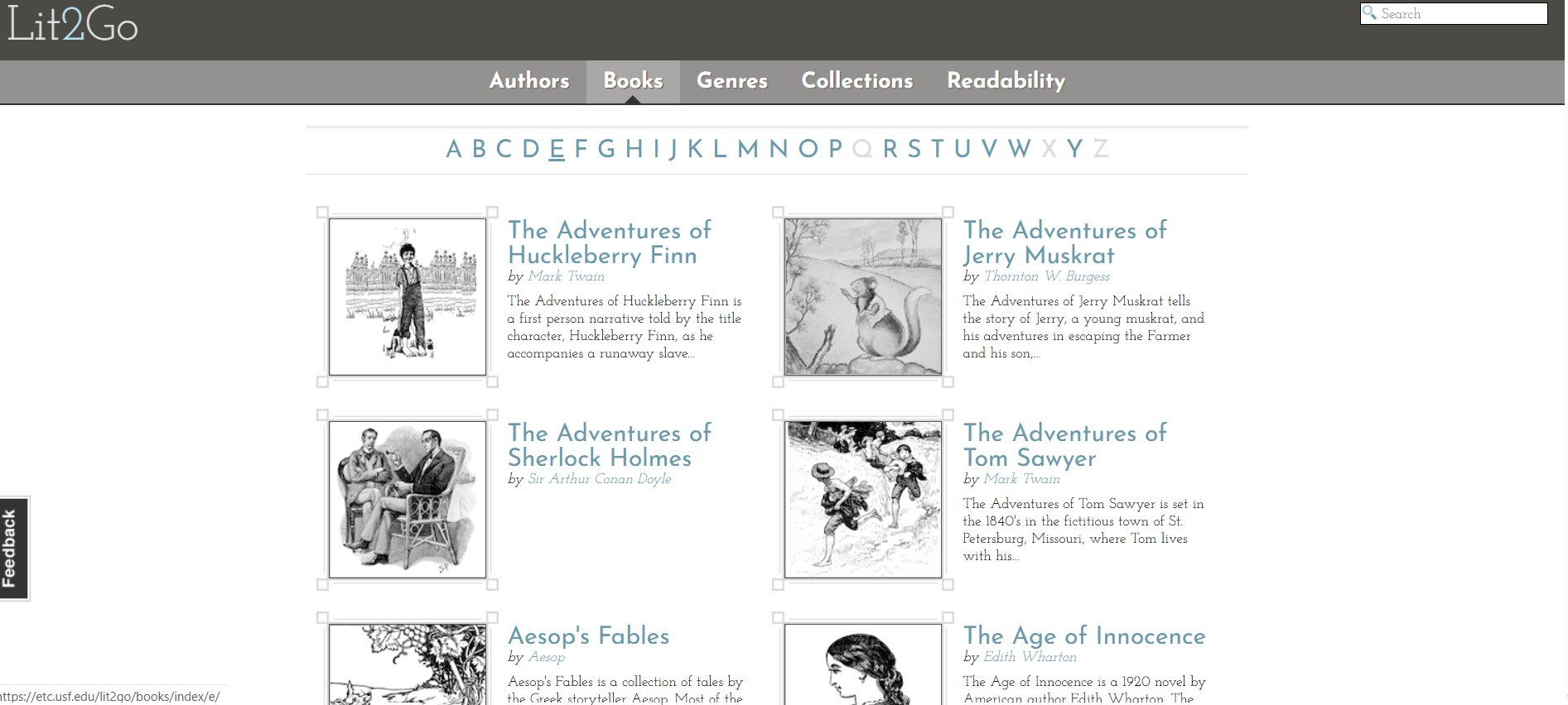 - Lit2Go (etc.usf.edu/lit2go) — Free audio and PDF versions of classic stories and poems.