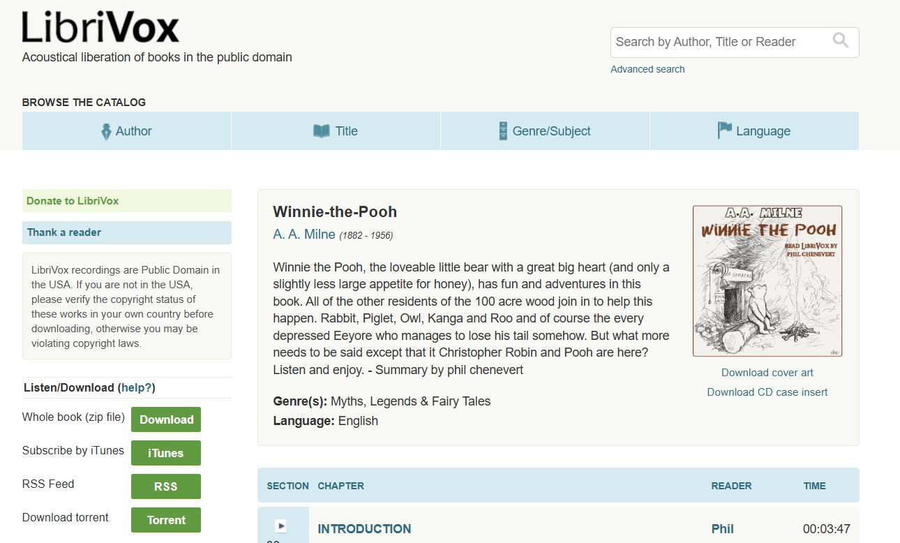 - LibriVox (librivox.org) Volunteer-read public-domain audiobooks (e.g., The Jungle Book, Winnie-the-Pooh).