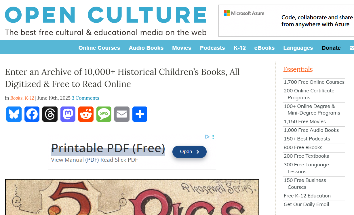 - Open Culture (openculture.com/free kids’ books) Links to free e-books and audiobooks from around the world.