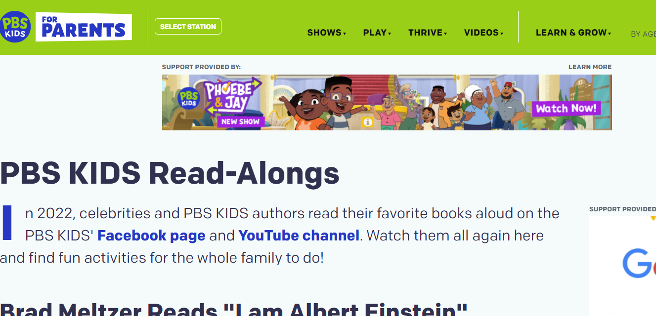 - PBS KIDS Read-Along (pbs.org/parents/read-along) Free videos featuring authors and celebrities, plus discussion questions and activities.